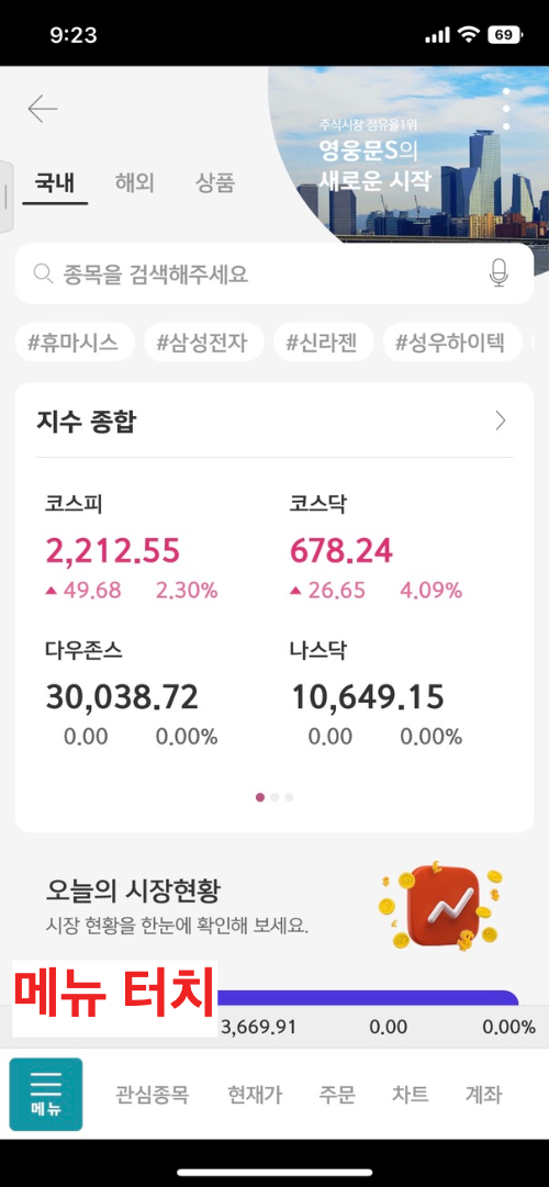 1. 먼저 키움증권 어플을 실행 > 하단에 '메뉴' 버튼 터치