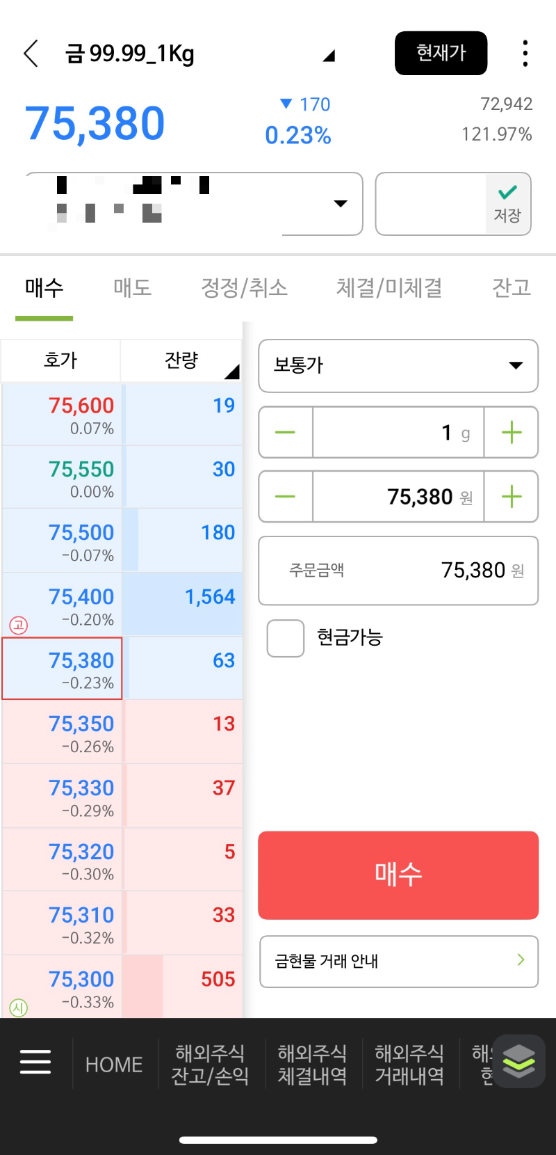 거래가 가능한 시간에 현재 금 시세를 확인하고 ( 좌측 ) 그램당 가격을 입력하고 '매수' 버튼을 터치합니다.